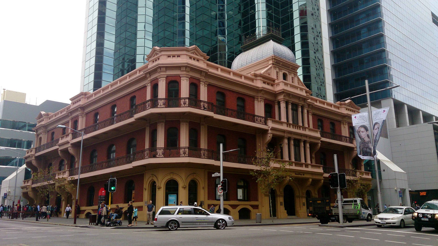 The Town Hall: opened in 1870,built in stone, lime and brick. It has become part of Perth’s folklore as well as part of the landscape. Had it not been for strong public opposition, the building would have been lost in the 1890s as the City Council decided it required a ‘more suitable’ building, presumably echoing the much grander town halls of Melbourne and Sydney. It has been well preserved since then, restored in 2005.